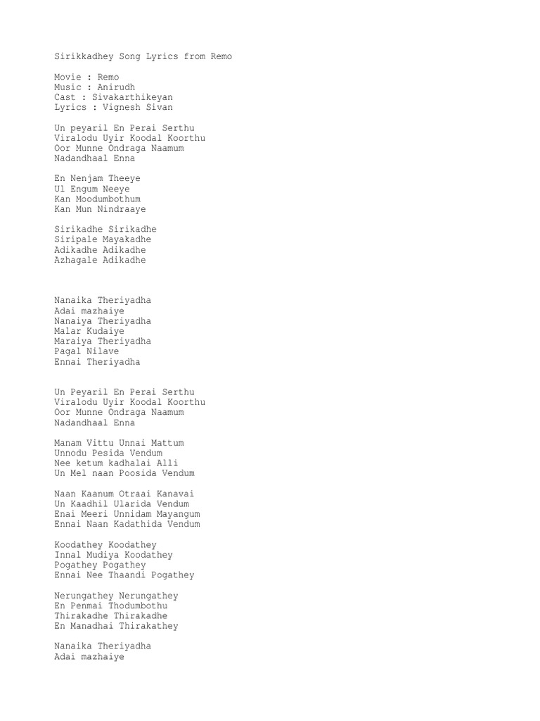 Remo Sirikkadhey Song Lyrics : Sirikkadhey song lyrics from remo by va.