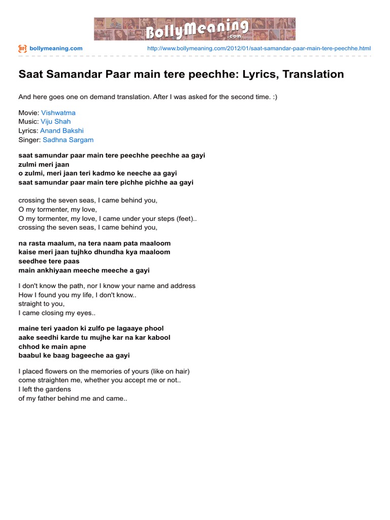 Bollymeaning Com Saat Samandar Paar Main Tere Peechhe Lyrics Translation Bollywood Cinema Of India - Saat samundar paar gayi mai sab kuch thujh per haar gayi mai song par dance by tanishka gautam.